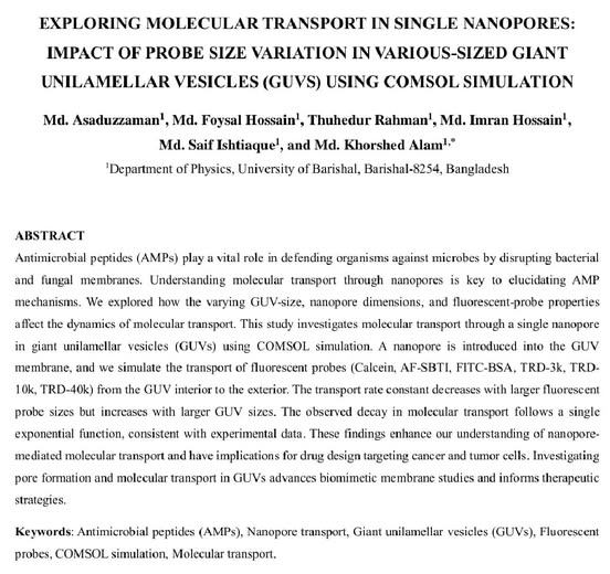 📄 Exploring Molecular Transport in Single Nanopores: Impact of Probe Size Variation in Various-Sized Giant Unilamellar Vesicles (GUVs) Using COMSOL Simulation" This work focuses on the dynamics of molecular transport through nanopores in GUVs, contributing to our understanding of antimicrobial peptides and their mechanisms, with implications for drug design in cancer therapy.