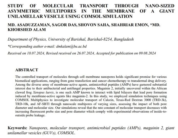 "Study of molecular transport through nano-sized multipores in the membrane of a giant unilamellar vesicle using COMSOL simulation" – Biophysical Journal.